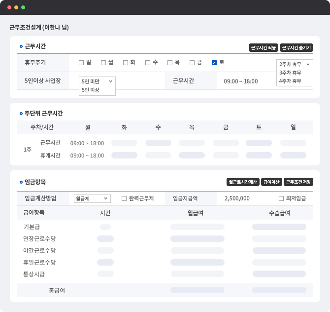 요일 별 근무시간 설정은 물론 다양한 휴무주기까지 반영