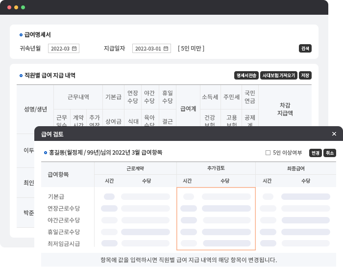 추가 근로시간만 입력하면 연장·휴일·야간근로수당 자동산출