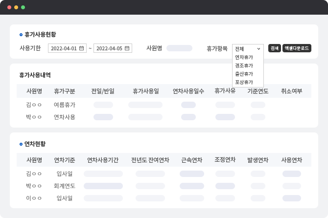 개인별, 휴가 항목별 사용현황 제공으로 잔여일수 간편 확인